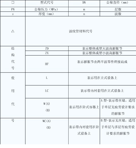 表示:工作壓力為0.6MPa,通徑DN=100mm,波數(shù)為20,法蘭連接的復(fù)式波紋膨脹節(jié)。