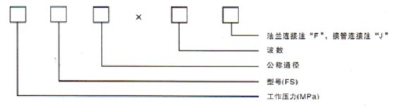 舉例:0.6TNY500TF 表示:公稱通徑為Φ500,工作壓力為0.6MPa,(6kg/cm2)波數為4個,帶導流筒,碳鋼法蘭連接的內壓式波紋補償器。